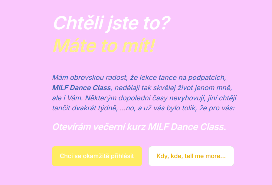 Věřím, že Ti stejně jako všem mým student*kám náš kurz MILF Dance class vnese do života spoustu nových kámošek, srandy a větší sebevědomí na tanečním parketě i v životě.